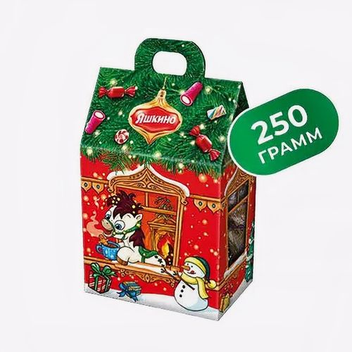 В качестве новогоднего подарка - игрушка в виде Деда Мороза. Высота составляет 40 см. Внутри находится мешочек с разнообразными сладостями: глазированными и неглазированными конфетами, карамелью, батончиками, жевательным мармеладом и шоколадным драже.