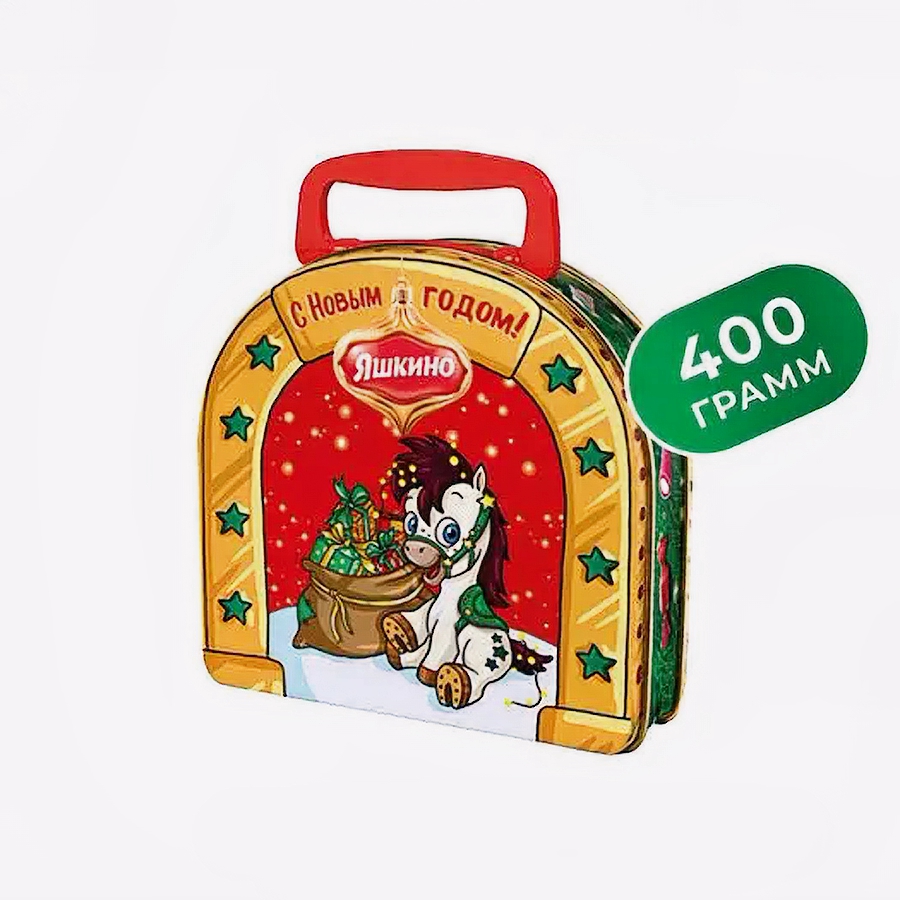Подарочный чемоданчик с удобной ручкой и ярким принтом "Подкова", символизирующим 2026 год, наполнен глазированными и неглазированными конфетами, карамелью и жевательным мармеладом. Эта красочная жестяная коробка, в которую упакованы сладости, может служить как ланч-бокс, так и шкатулка для хранения мелких предметов.