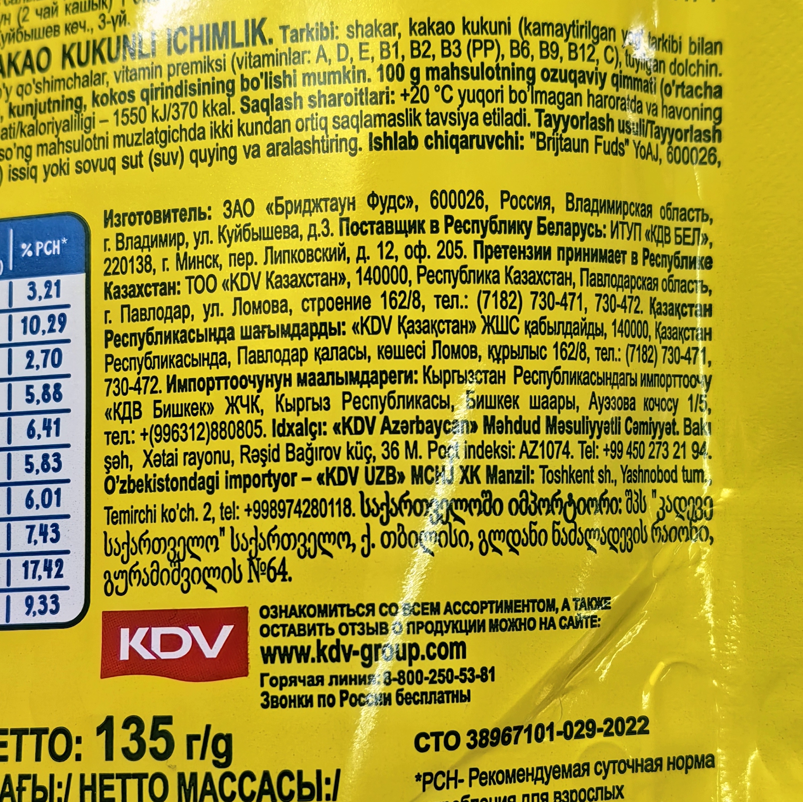 Состав: сахар, какао-порошок (какао алкализованный с пониженным содержанием жира, эмульгатор рапсовый лецитин), мальтодекстрин, соль, натуральные ароматизаторы, витаминный премикс (витамины: A, D, E, B1, B2, B3 (PP), B6, B9, B12, C), корица молотая.