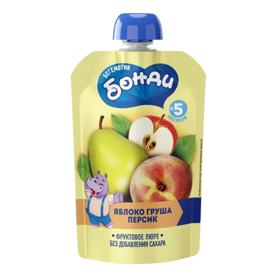 Пюре фруктовое БЕГЕМОТИК БОНДИ Яблоко, груша, персик (ДПак) 90г